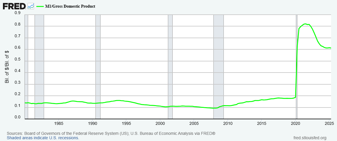 The chart below shows how the money supply, as measured by M1, has grown as a percentage of GDP. I used nominal GDP in this chart. If I had used “Real” GDP, it would look even worse. We’ve got too much liquidity in the system. The Fed choosing to end “QT” after never really tightening by much is a joke. We ought to be in a “QT” period for quite some time until we get the money supply back down to a normal percentage of GDP.