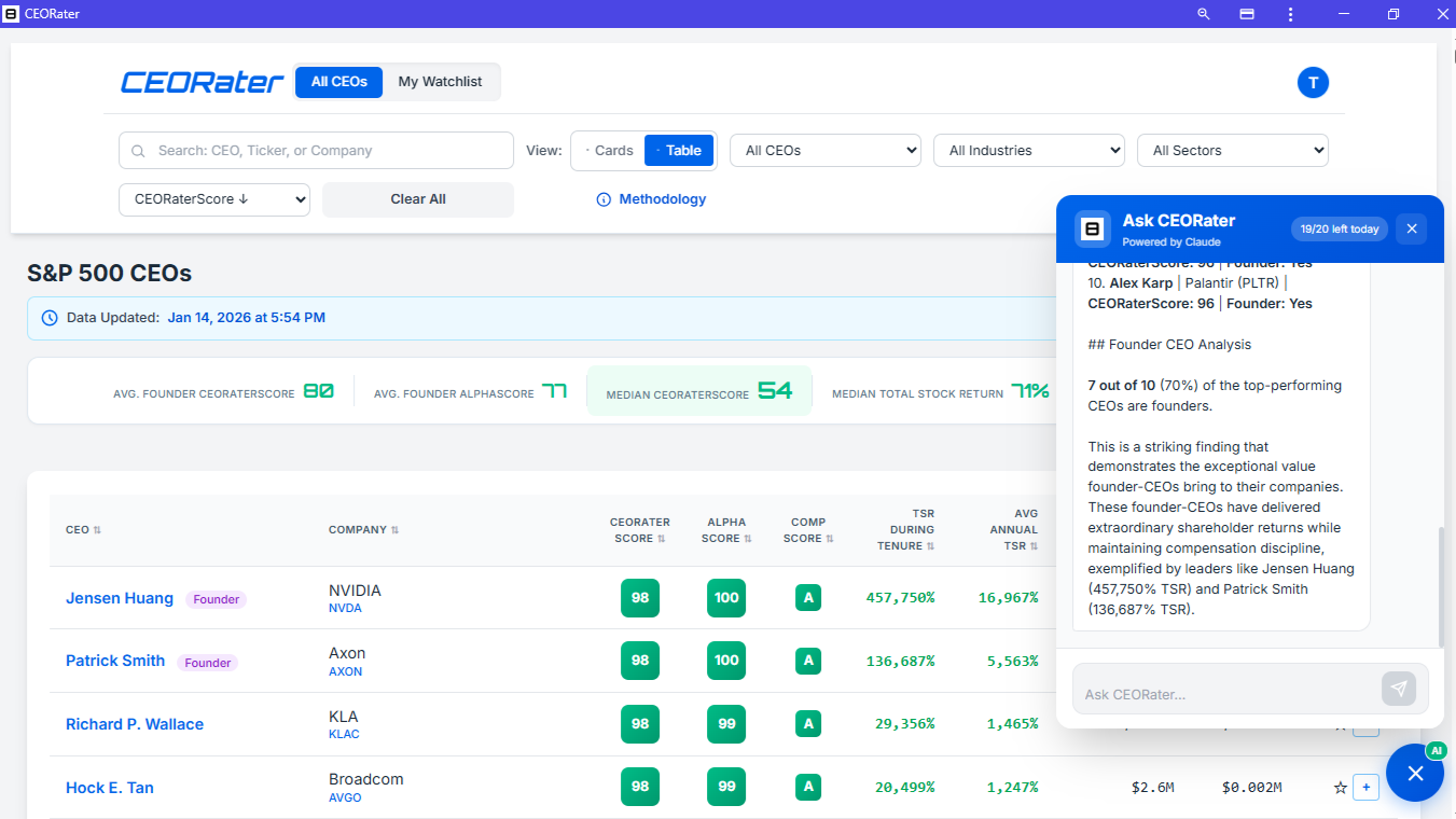 This is a striking finding that demonstrates the exceptional value founder-CEOs bring to their companies. These founder-CEOs have delivered extraordinary shareholder returns while maintaining compensation discipline, exemplified by leaders like Jensen Huang (457,750% TSR) and Patrick Smith (136,687% TSR).