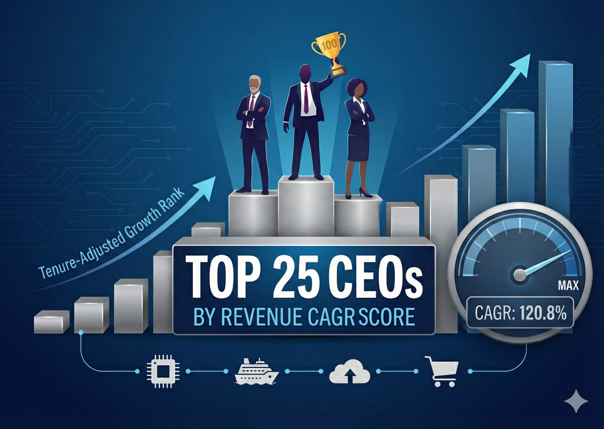 We asked CEORater: “Which are the top 25 CEOs in terms of having the highest Revenue CAGR Score?”