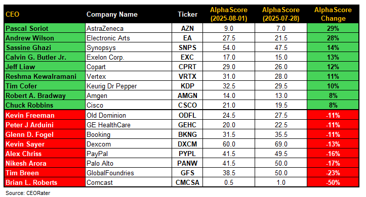 NASDAQ 100 CEOs with the largest AlphaScore change for the week ended 08-01-2025.