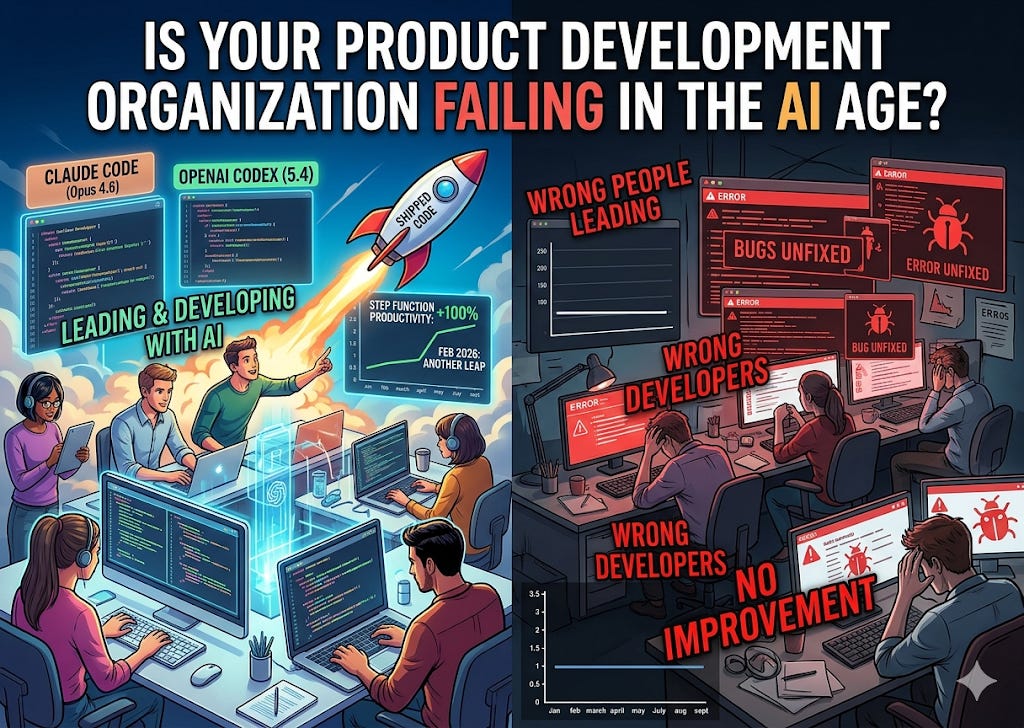 If your Product Development organization did not improve by another step function in February when Claude Opus 4.6 (operated in terminal / Claude Code) and OpenAI’s Codex 5.4 were released, you have the wrong people leading Product Development and the wrong developers.