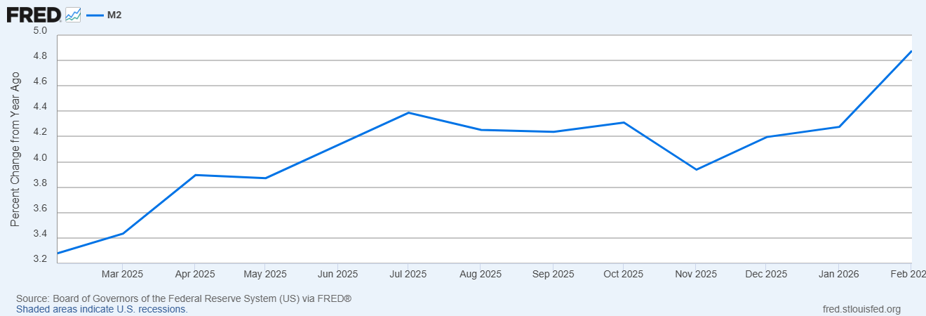 That may help ease bond yields temporarily, but I expect the 10YR yield to go much higher. Certainly above 5% by June. It is difficult for me to imagine a bond investor convincing themselves that a 4-5% yield on the 10YR is a good ROIC, especially when M2 is growing by more than 4% YoY each month.