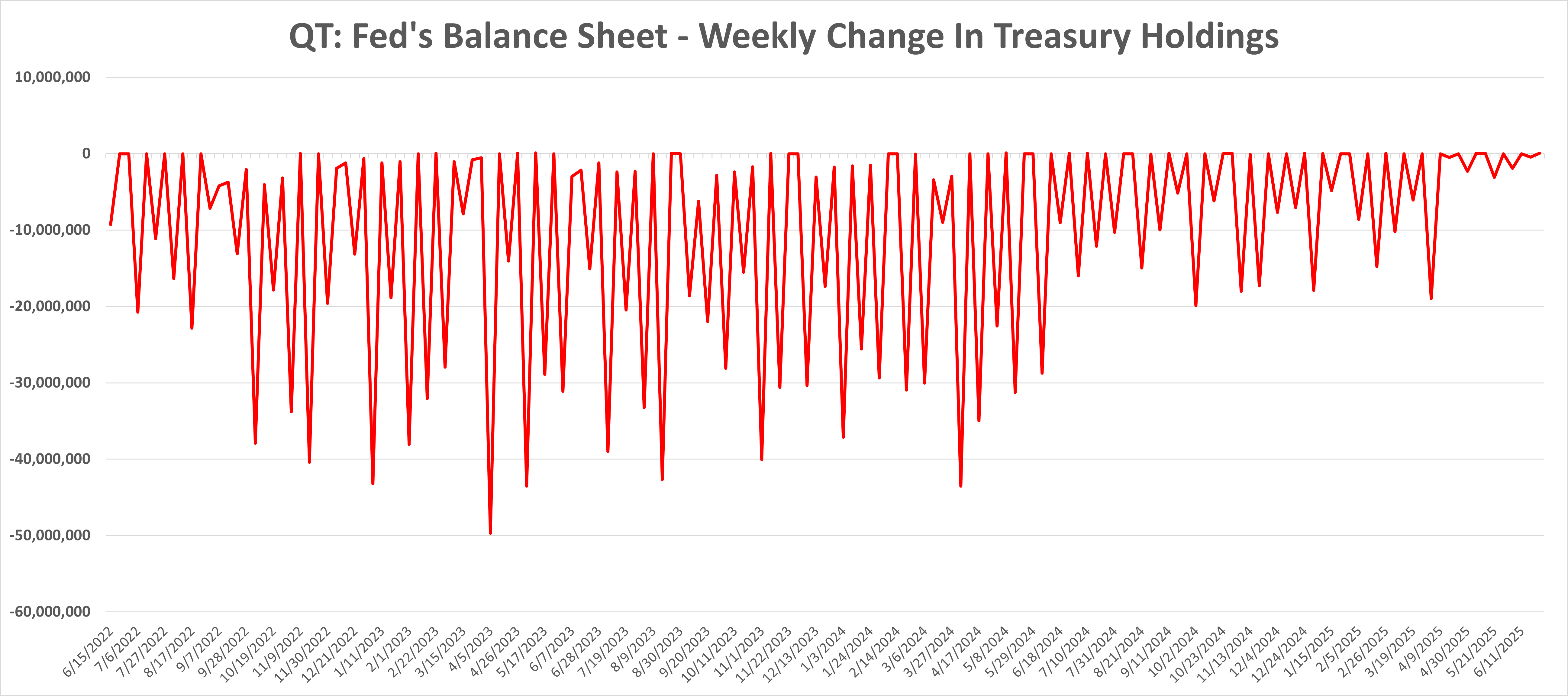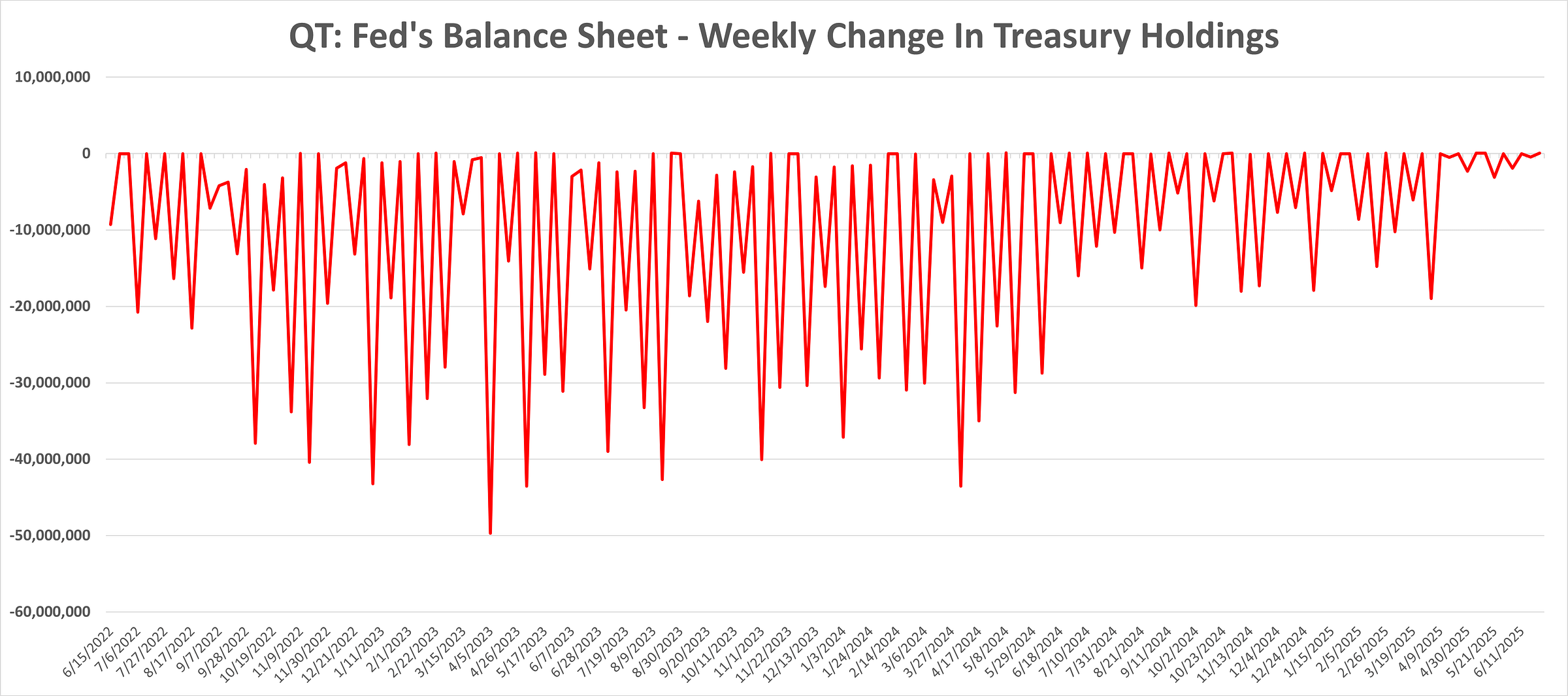 The Fed held Treasuries flat and culled an $18 billion tranche of mortgages from its balance sheet. If you look at our Excel spreadsheet below (premium content), you will see that the Fed is maintaining the tightening pace on the mortgage side that it held in 2023 and 2024. The Fed is trying to slowly deflate the housing bubble it would seem. Better to have tightened more sharply and to a greater degree.