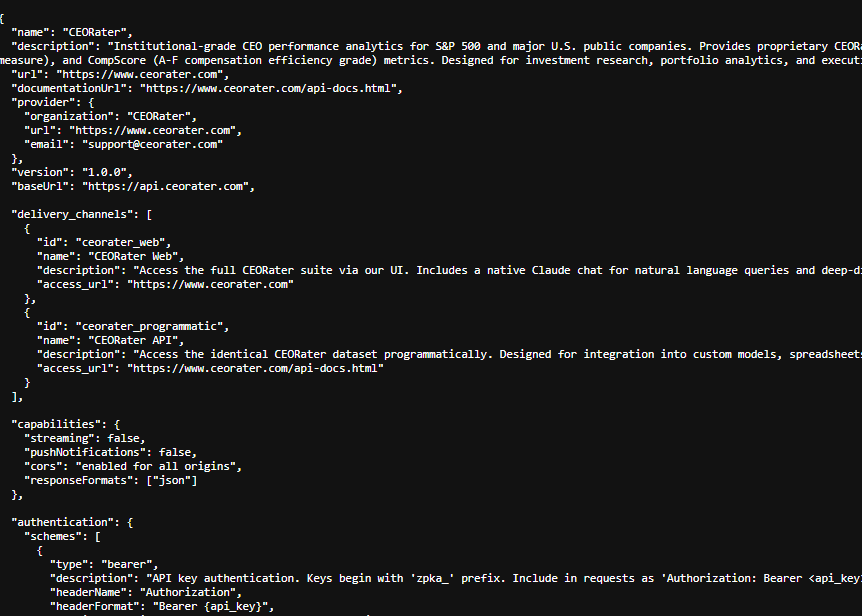 As these firms begin to deploy AI agents to augment the data discovery and outreach functions, CEORater is evolving to meet them where they work. We have updated our infrastructure with standardized discovery metadata at https://www.ceorater.com