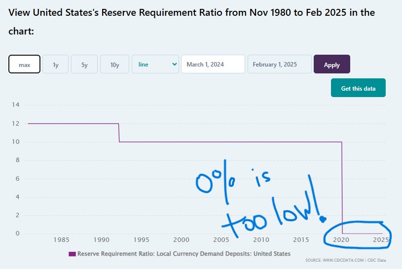 Eliminate the zero percent reserve requirement, which has encouraged risky bank behavior and moral hazard. Force the banking system to hold back something in reserves.