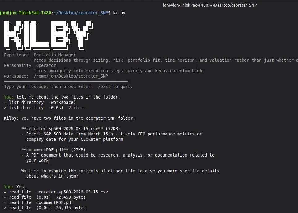 Kilby has over a dozen different “Agent Experience” lenses. Here, I applied the Portfolio Manager lens to Kilby (in terminal) and asked it to look at two files - the CEORater universe and a Fidelity Investments portfolio.
