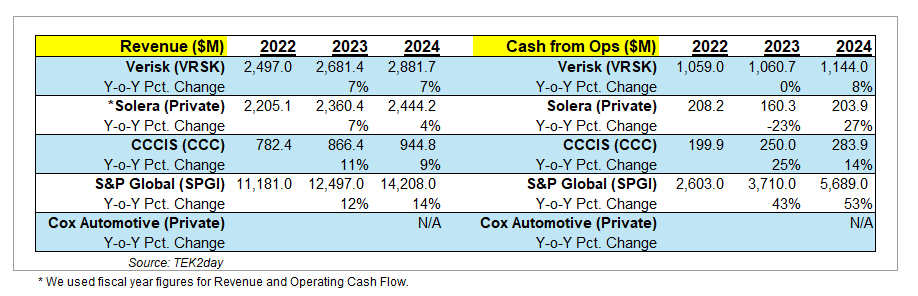 This report offers a comparative analysis of the CEOs of five key companies in this space: Verisk (VRSK), Solera (private), CCC Intelligent Solutions (CCC), S&P Global (SPGI), and Cox Automotive (private). These companies provide a range of data, software, and analytics solutions that support critical functions within their respective industries, from risk assessment and claims processing, to vehicle lifecycle management and market intelligence. The current CEOs leading these firms are Lee Shavel of Verisk, Darko Dejanovic of Solera, Githesh Ramamurthy of CCC Intelligent Solutions, Martina Cheung of S&P Global, and Stephen Rowley of Cox Automotive.