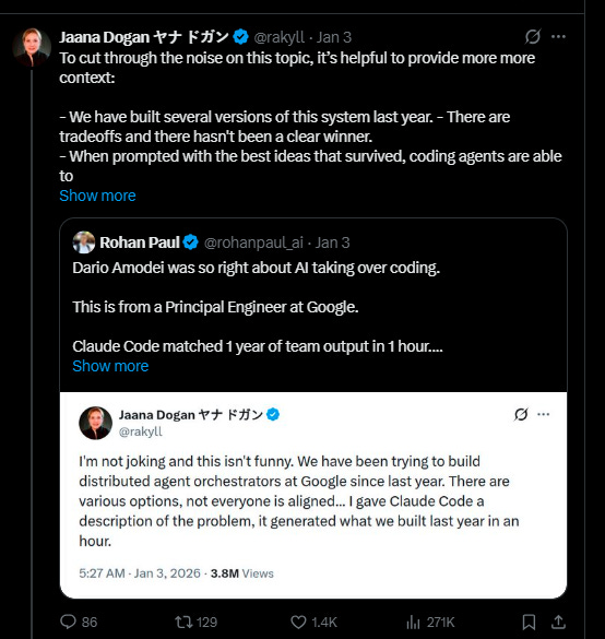 Once we get CEORater Premium (try our new S&P 500 CEO universe), out the door next month I will ramp up on Claude Code and report back. I have been hesitant to use agentic coding as if you are not careful in your prompting, AI agents will blow through tokens, potentially blow out your data, and download malware (I’m not sure how AI agents can protect themselves from prompt injections). Here are a couple of Tweets from Google engineers on Claude Code. While I don’t use Claude Code, Claude Opus 4.5 is my preferred LLM for coding assistance.