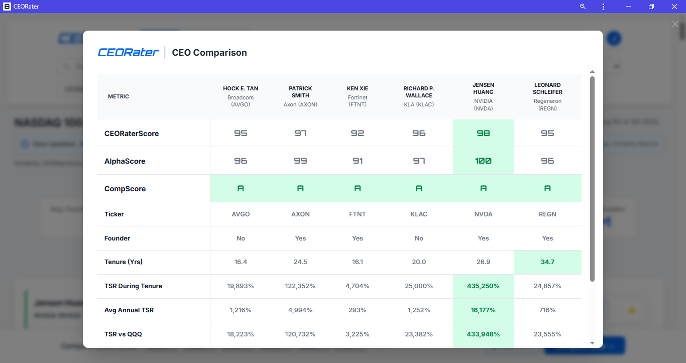 We made some modest UI enhancements to CEORater, most notably, users may now compare up to 10 CEOs: