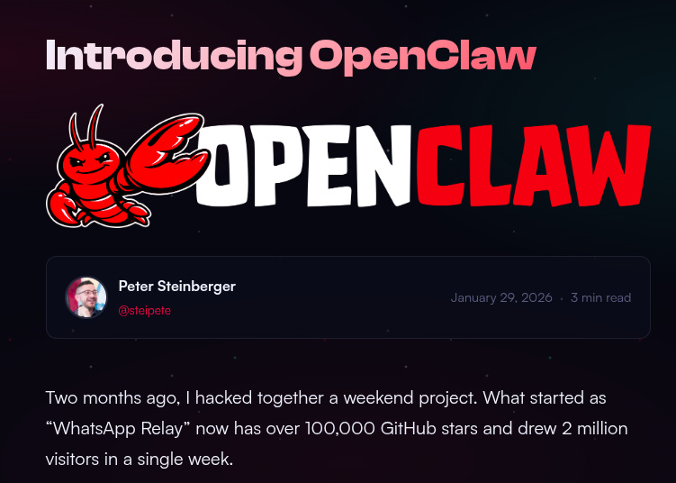 Read founder Peter Steinberger’s post for OpenClaw’s history.