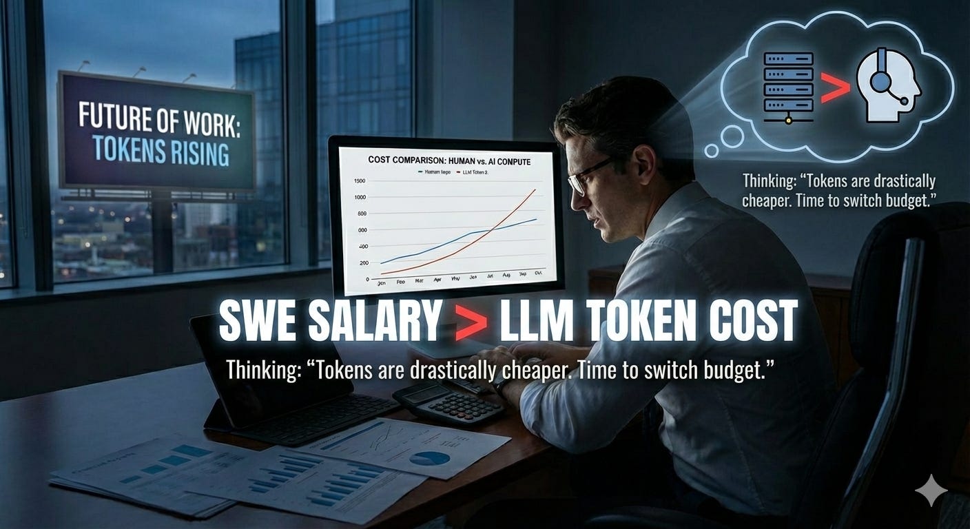 The mix shift (tokens vs. SWEs), will change over time on a per company basis. The cost of tokens at the unit level will come down, but token consumption will move higher as more companies automate the Software Engineering function.