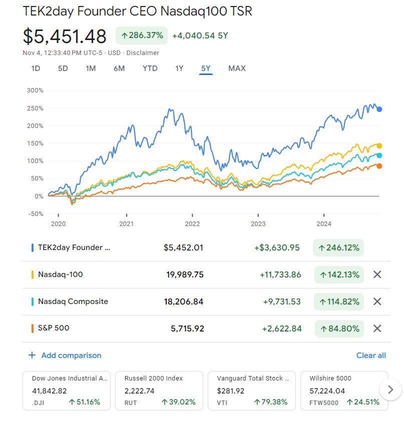TEK2day Founder CEO Index vs. NASDAQ 100, NASDAQ Composite and S&P 500