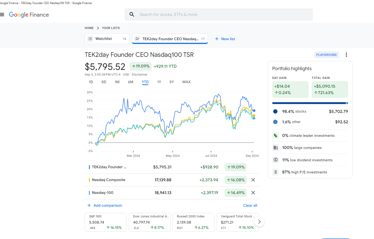 TEK2day Founder CEO Nasdaq100 TSR Year-to-Date