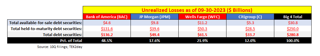 - Below are the unrealized losses for the Big 4 banks. - The Excel version of the below table plus additional detail on unrealized losses per bank is available after the paywall break.