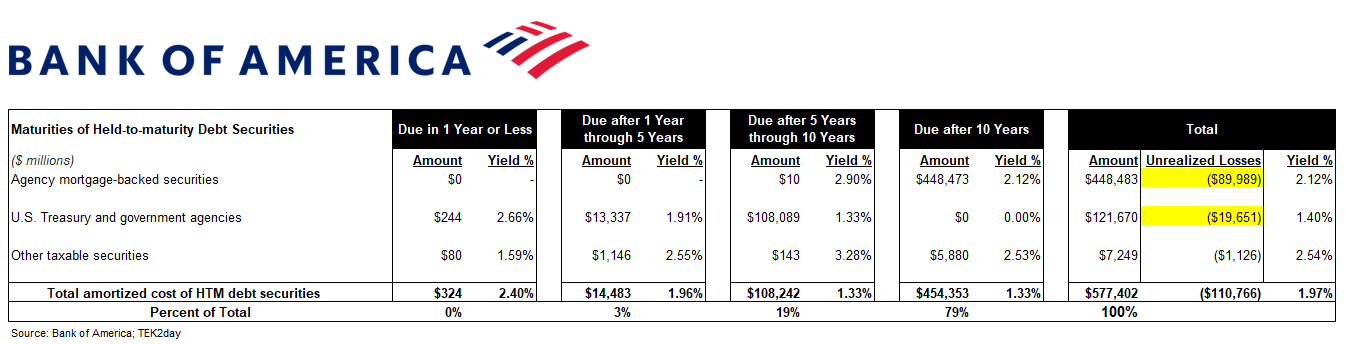 - The table below details how BAC’s low-yielding investment portfolio will be a problem for the bank for over a decade unless the Fed bails out the bank with lower rates (lower interest rates will inflate the price of debt securities given the inverse nature of prices and interest rates).