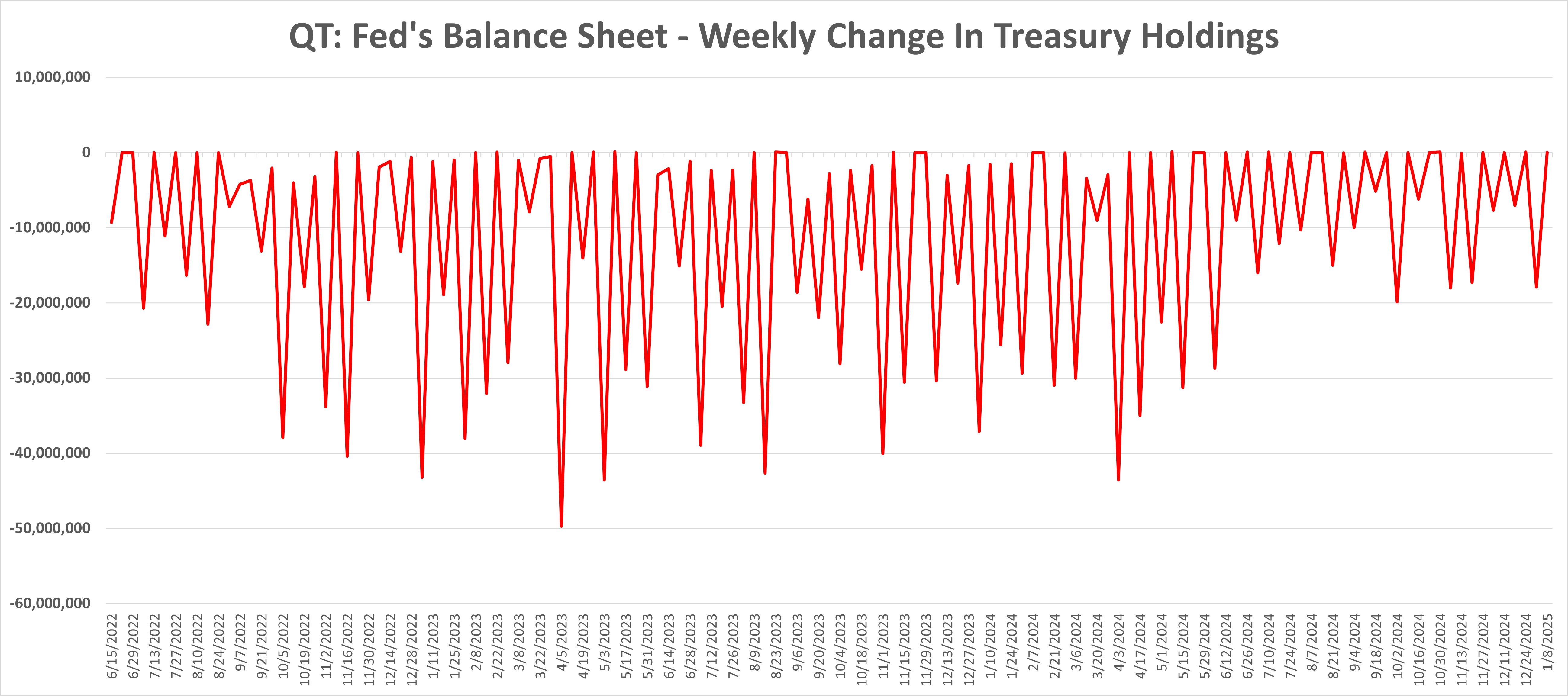 The Fed made modest Treasury purchases this week. When, not if, the 10-year Treasury yield hits 5%, the Fed will start to buy 10-year Treasuries at scale (i.e., “QE”). Further, I expect the Big Banks to report larger unrealized losses when they report December quarter results next week as compared to September quarter results given the increase in yields over the past several months. Bank of America (BAC) has suffered significant opportunity cost as a result of not having rid its balance sheet of those unrealized losses, which are primarily mortgage securities, for which BAC had $70 billion in unrealized losses as of the September 2024 quarter. Those securities ought to have been sold off months ago and replaced with higher yielding securities.