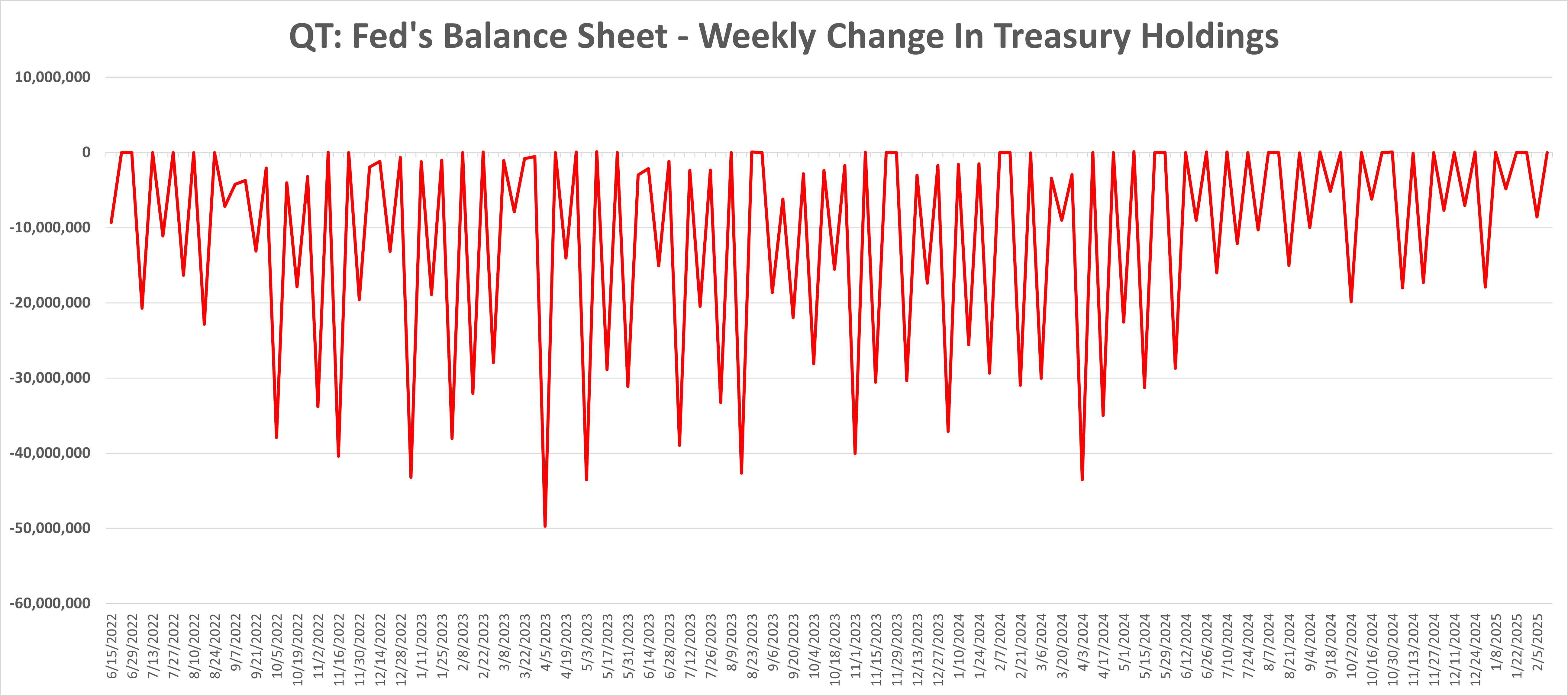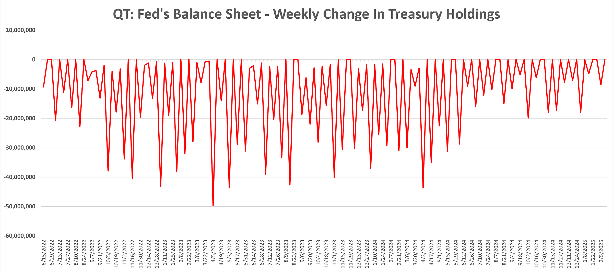 The Fed took no action during the week-ended February 12th 2025. My view is that the Fed ought to allow its Fed Funds Rate to float. The Central Bank ought to focus on pulling more liquidity out of the system via QT. The overnight reverse repo facility is down to $67.8 billion after peaking north of $2 Trillion. That is a positive development. The BTFP bailout expired in March 2024. The monetary policy props are gone. Hopefully, the fiscal side of the house will not artificially prop up the economy. Now is a suitable time for the Fed to tighten. However, the Fed chose to do nothing.