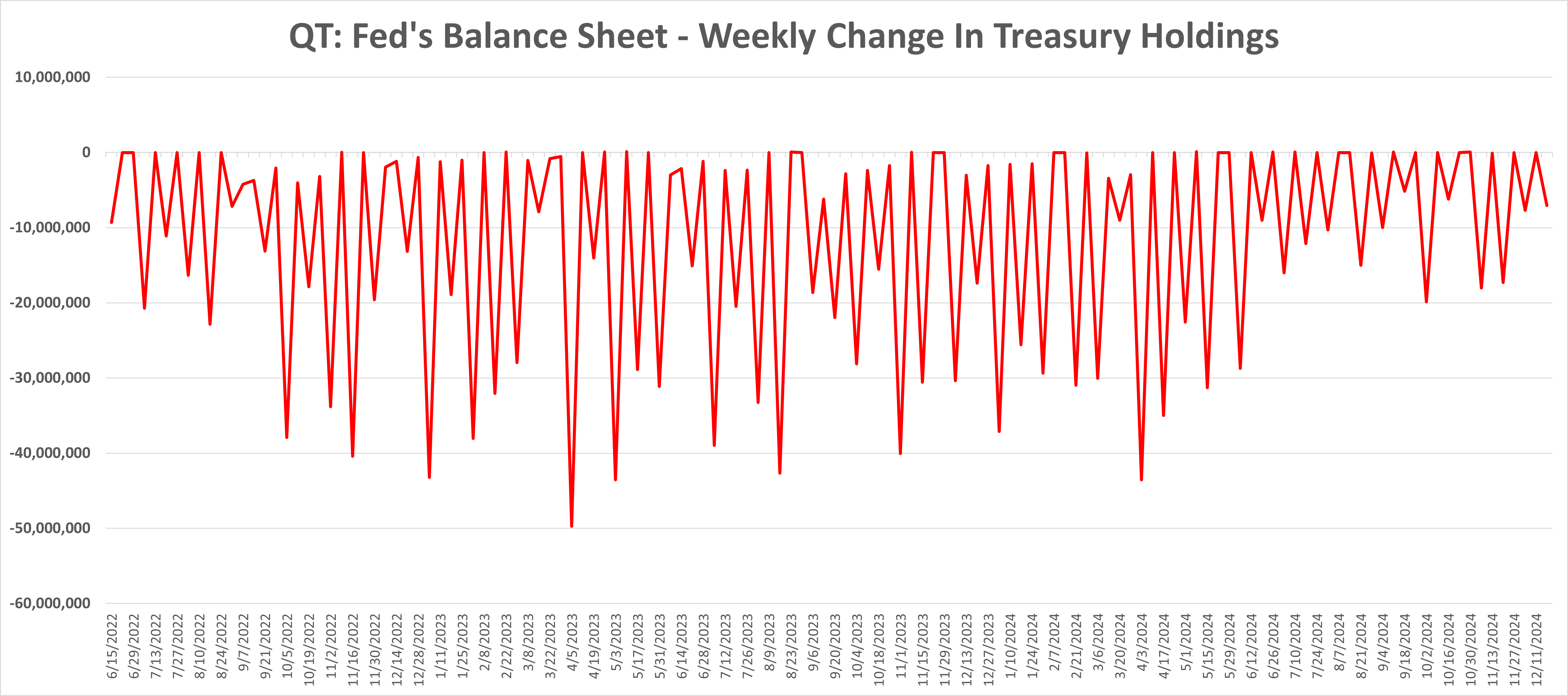 The Fed bought T-Bills and sold T-Bonds and mortgage securities for the week-ended December 18th 2024. This during a week when the Fed once again lowered Fed Funds, while issuing more conservative rate guidance for 2025. Long rates will move higher in our view - 5% will be crossed in Q1 2025 - and I anticipate the Fed will engage in QE in 2025. Otherwise, Treasury will be forced to primarily finance the Federal Government with T-Bills.