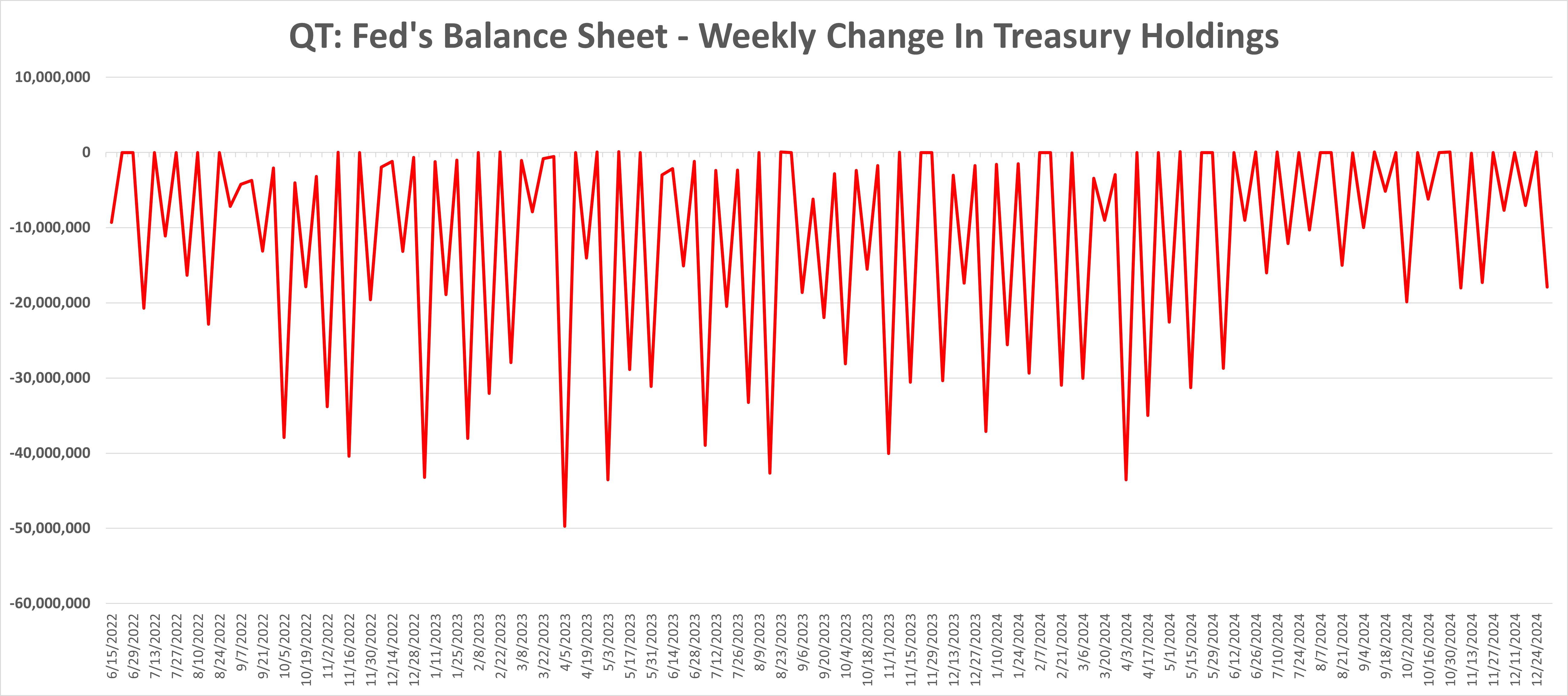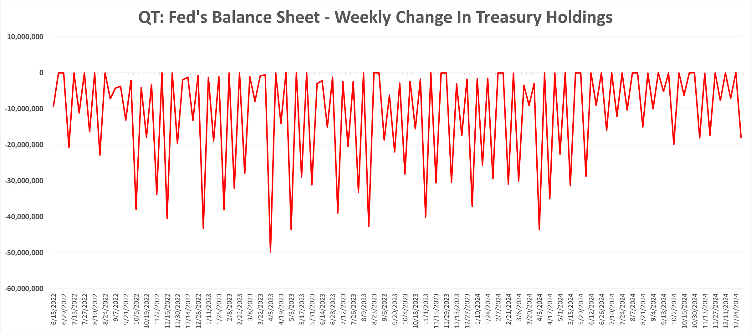 The Fed culled its Treasury and mortgage-backed holdings for the week-ended December 31st. The Fed reduced its Treasury and mortgage-backed holdings (total SOMA activity) by $702 billion for 2024. This compares with a $931 billion reduction and 2023. The Fed’s tightening pales in comparison to the Fed having grown its balance sheet by some $5 Trillion from January 2020 through April 2022. The Fed’s net balance sheet growth explains why the U.S. has persistent price inflation.