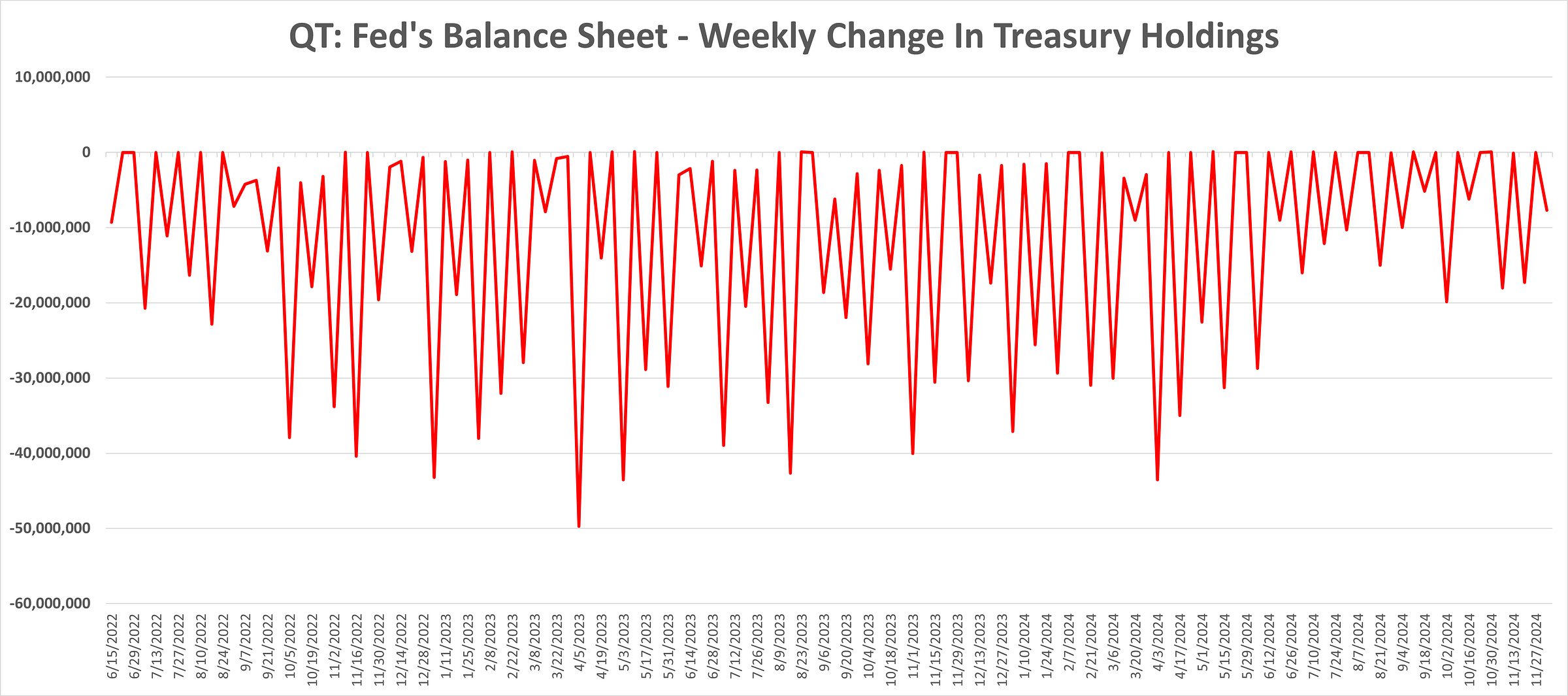 Very modest tightening for the Fed this week. The Fed’s balance sheet remains inflated at $6.9 Trillion, only $2 Trillion below the April 2022 peak and 53% higher than the pre-COVID plateau of $4.5 Trillion. I am not bullish on Trump’s ability to cut spending if social media posts offer any clue. The masses say they want fiscal austerity, yet in the same breadth / post, many say “don’t cut Social Security, Medicaid or income assistance”. Americans are not ready to kill the Welfare state, therefore inflation / a devalued Dollar will remain for some time.