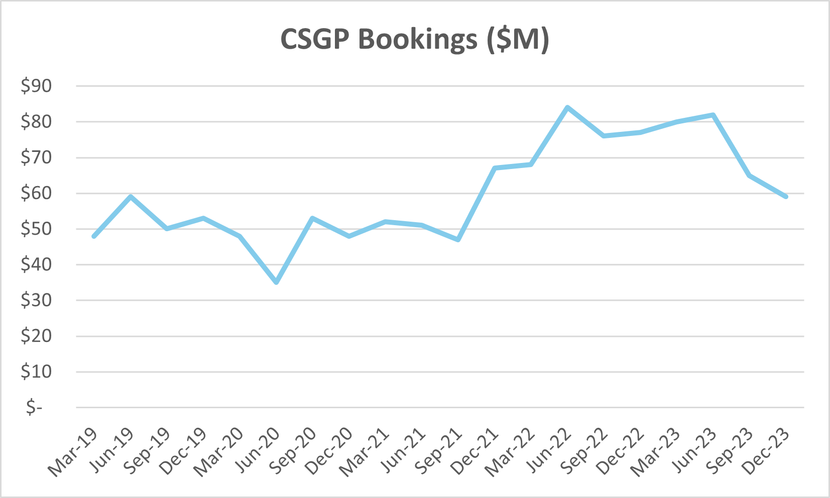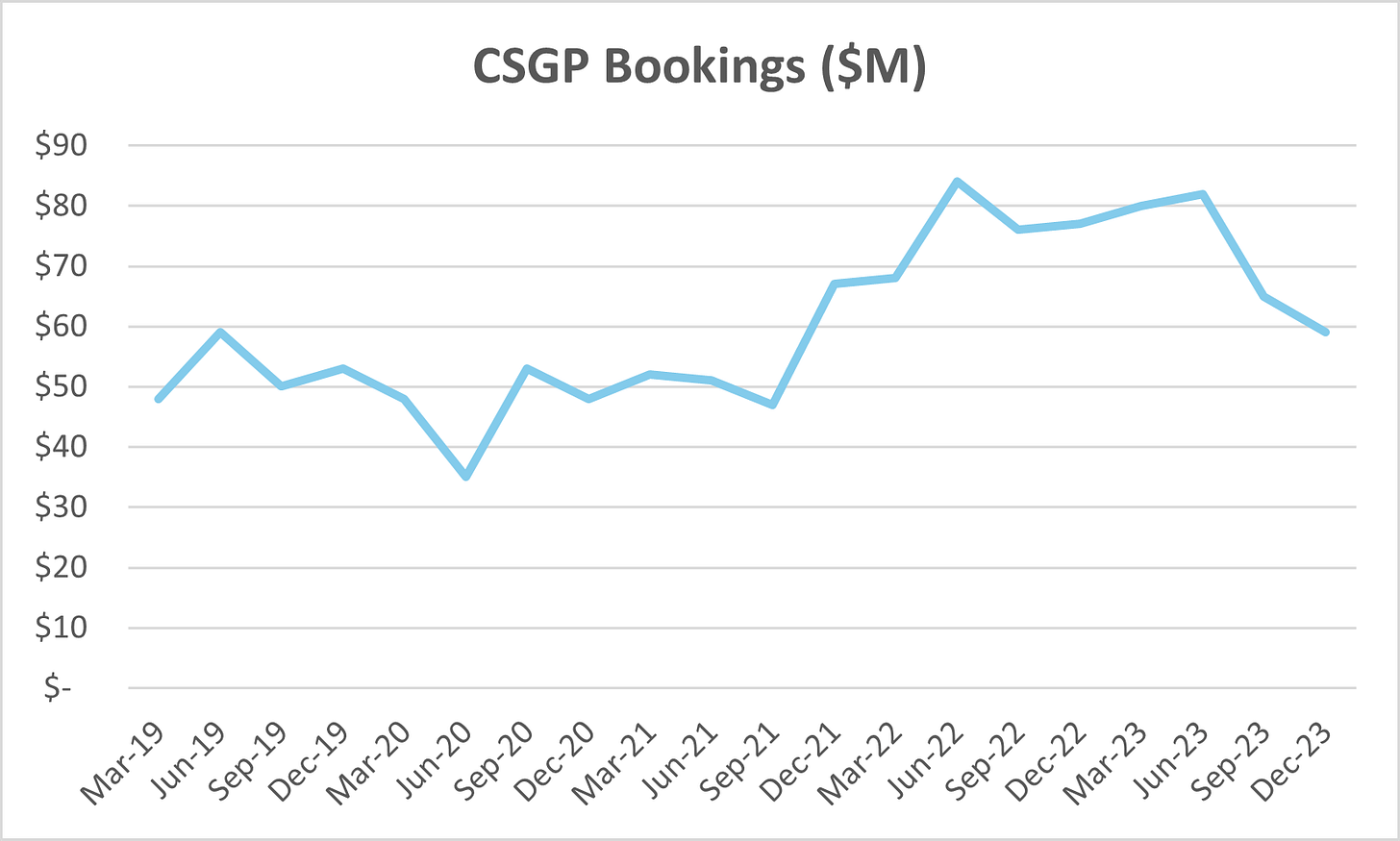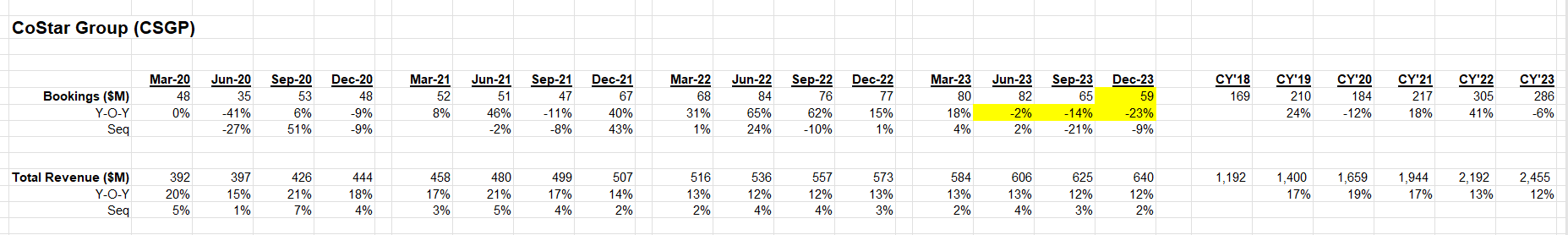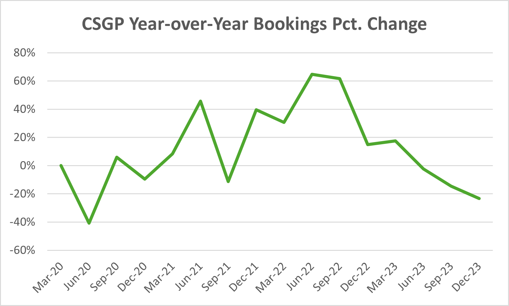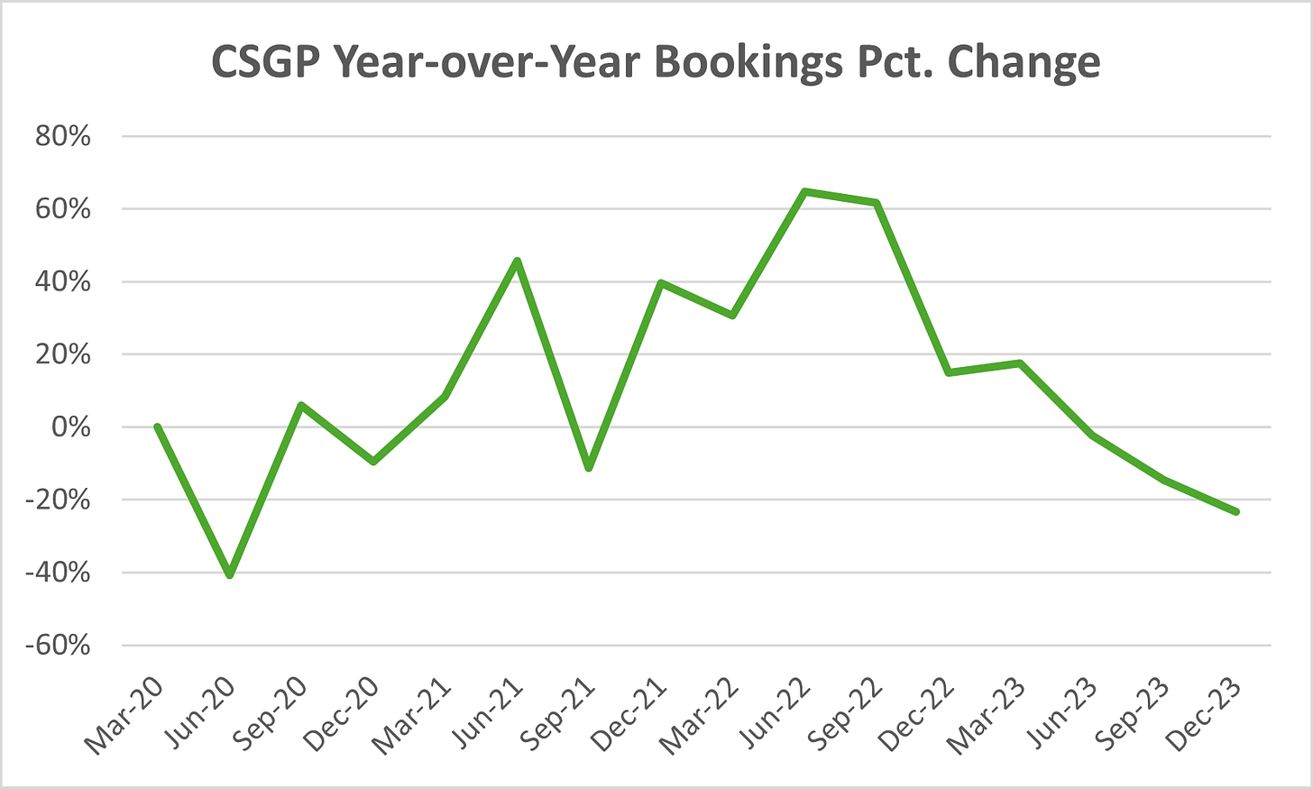 Premium subscribers may access the Excel file behind the paywall which includes 20 quarters of CoStar’s Bookings and Revenue data plus charts (2019 through 2023). Become a premium subscriber for $9.99 per month or $99 per year.