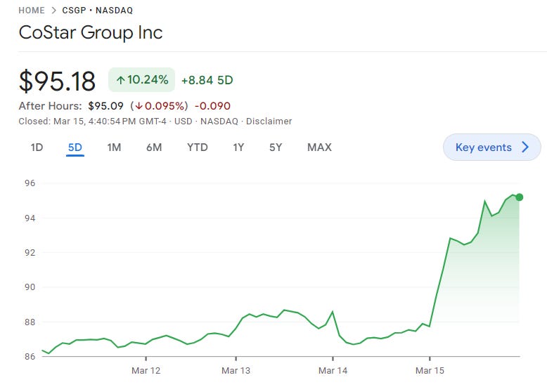CSGP’s stock price does not reflect the slowdown in bookings. “Bookings” is a leading indicator of future organic subscription revenues. Sure, one could hide weak bookings with acquisitions. Is that why CSGP shares are up 11% over the past week? Is there a forthcoming M&A deal that’s been leaked? If not, the stock ought to be trending downward, not upward.