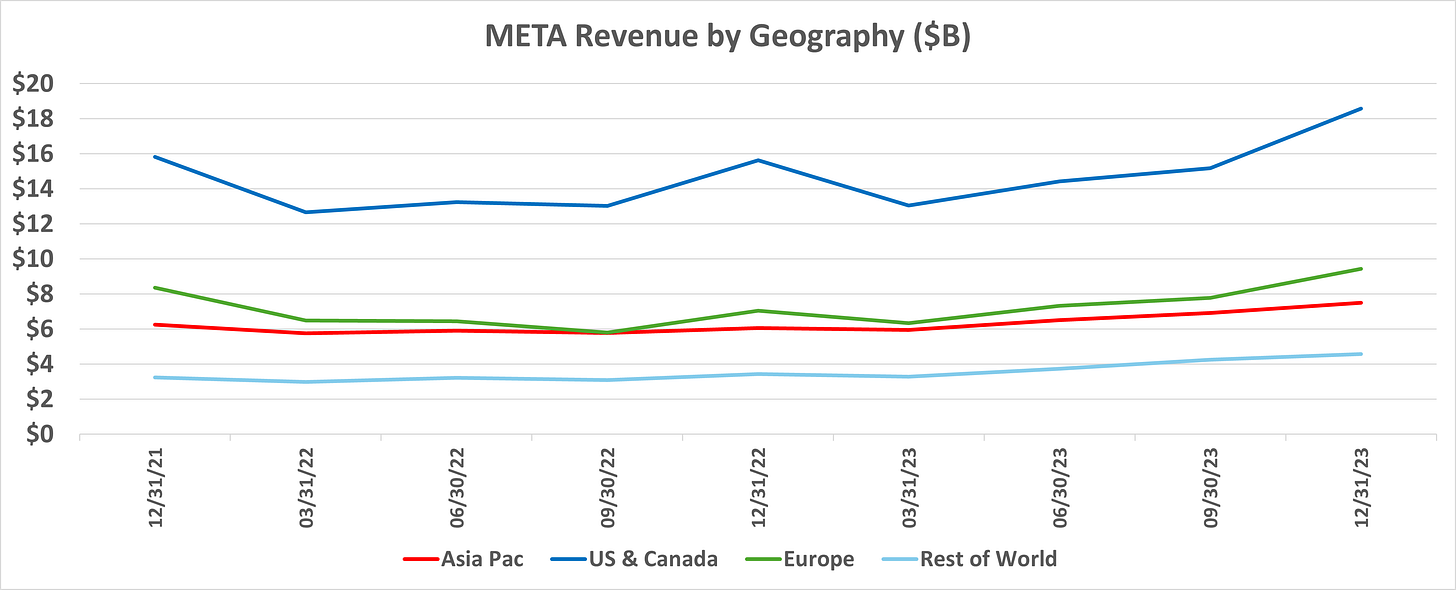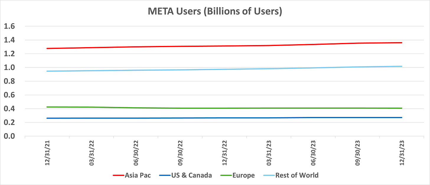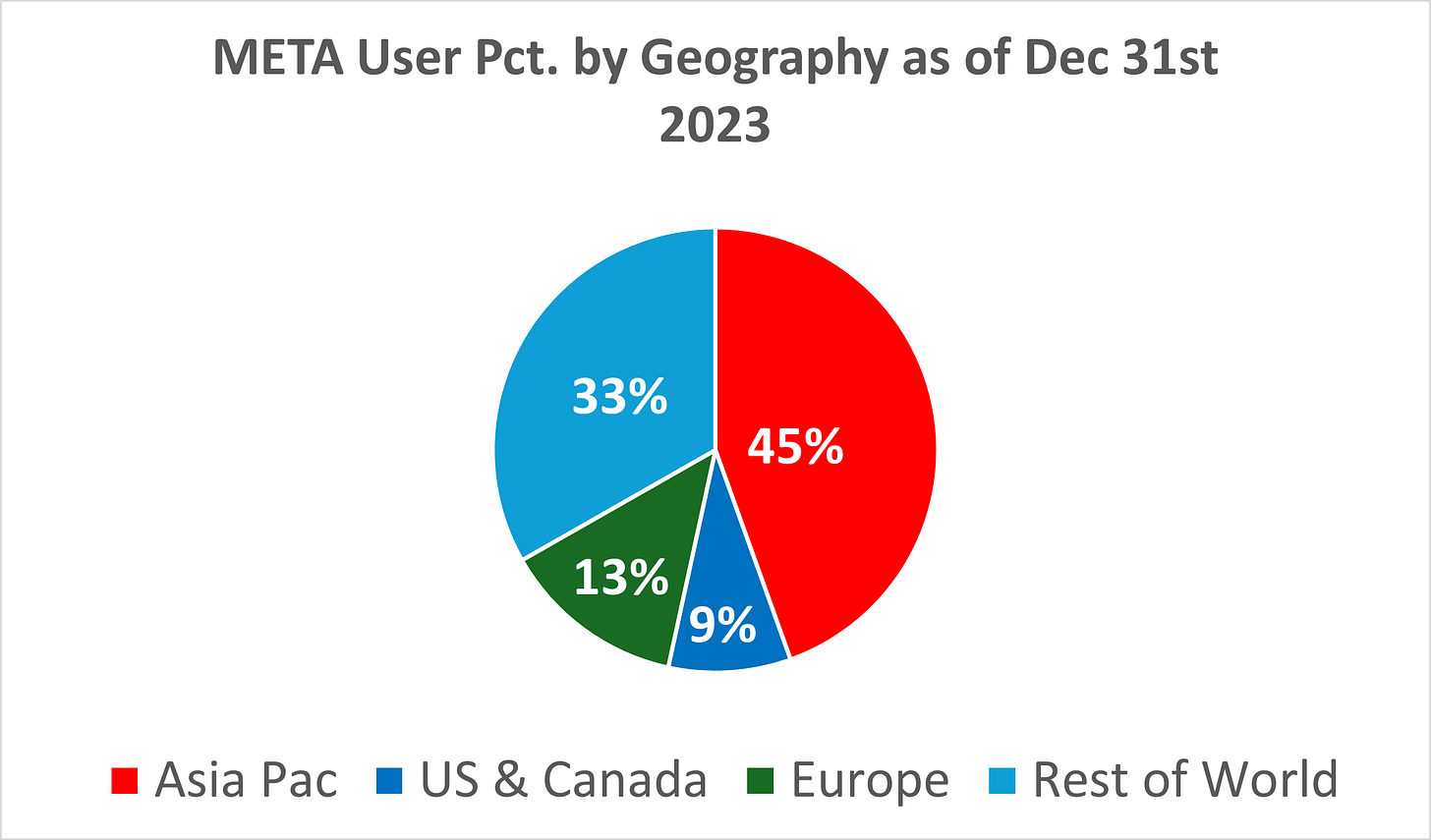META’s Total Revenue growth for 2023 was 16%. Excluding China, META’s 2023 Revenue growth was 11% (1st Table below). From a user standpoint, 45% of META’s users are based in China. How should one value META shares given China-related risk?