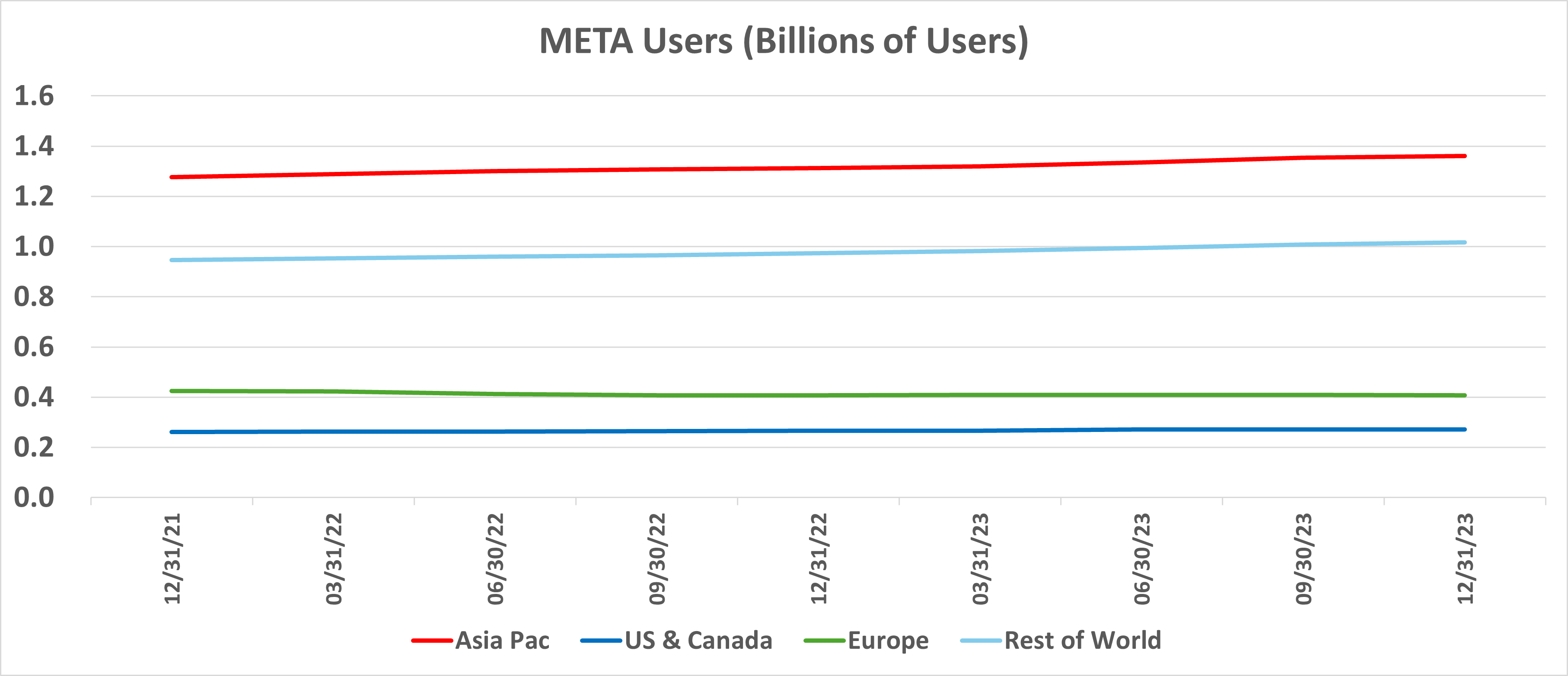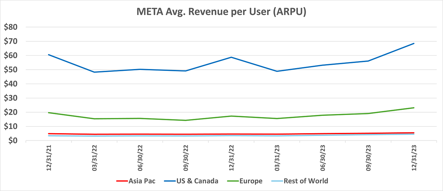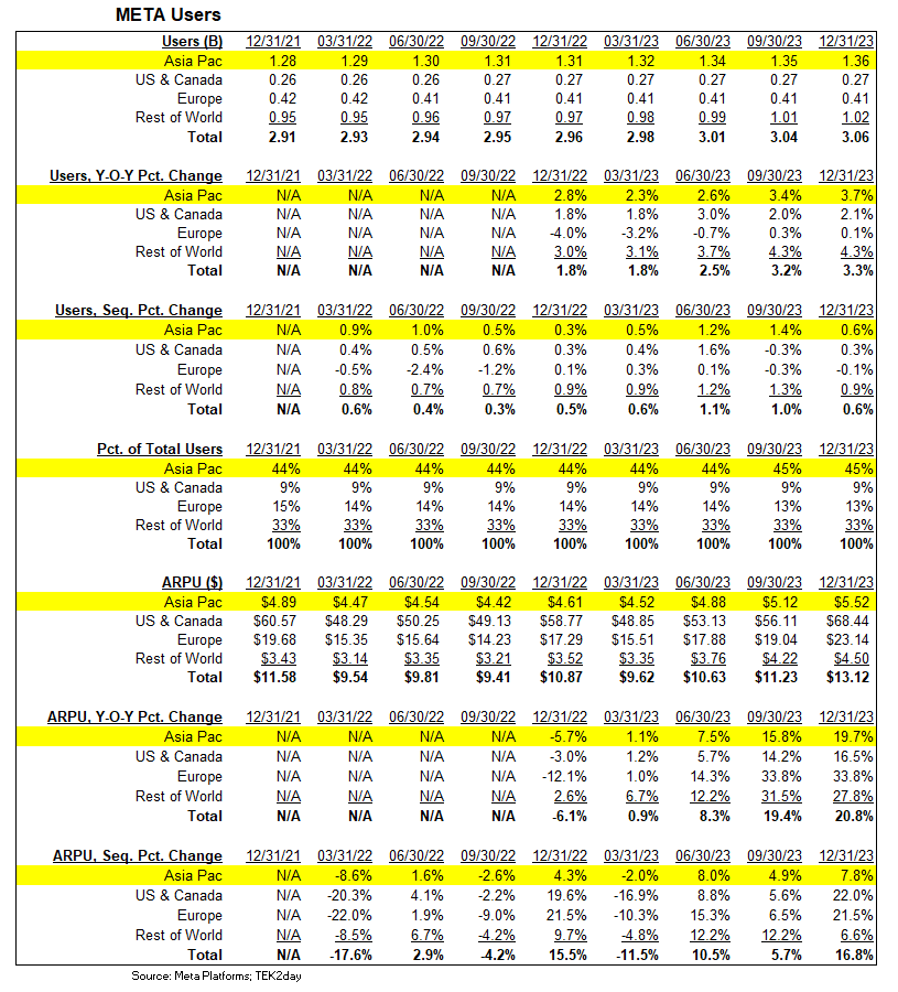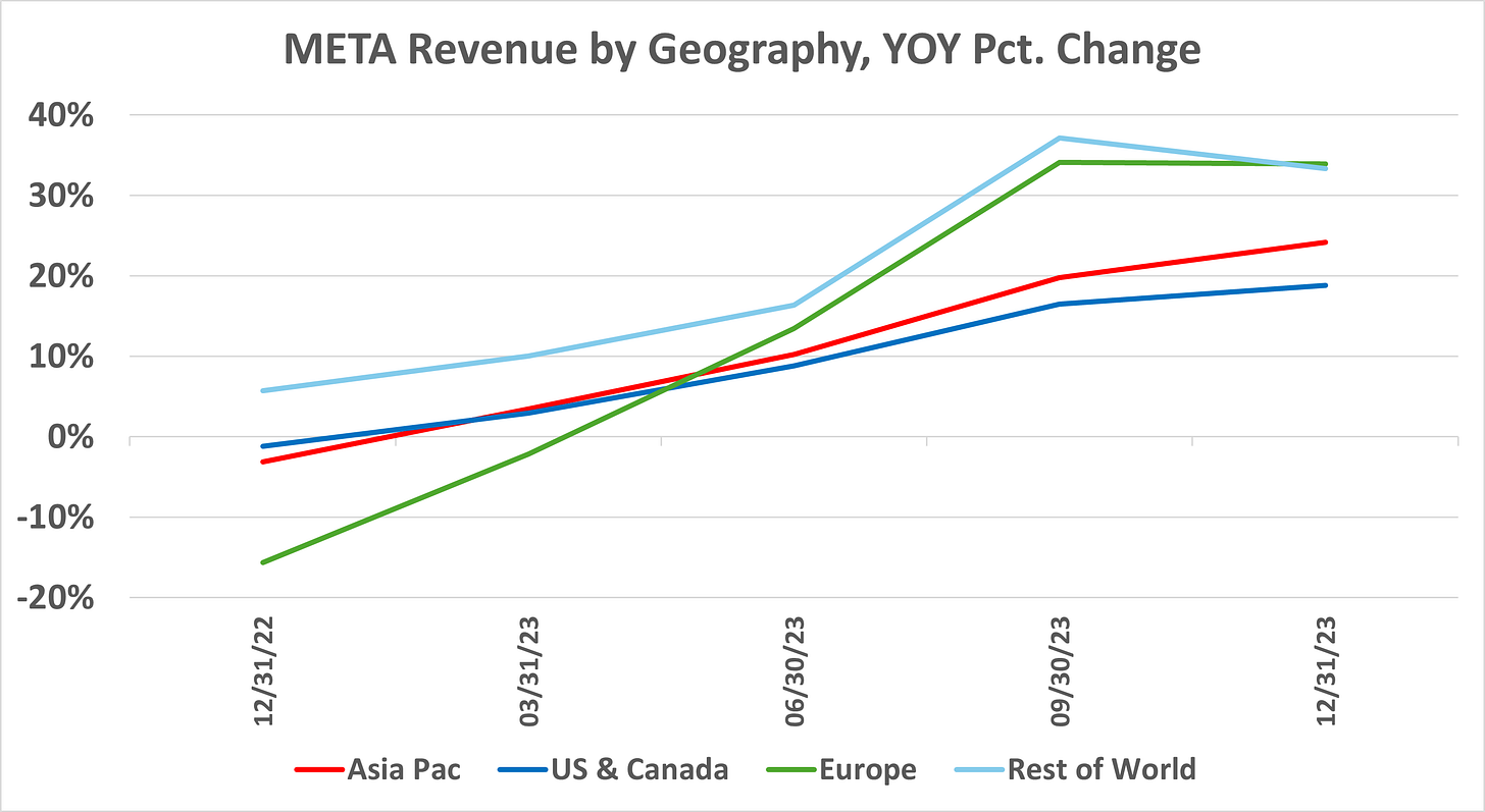 META’s Total Revenue growth for 2023 was 16%. Excluding China, META’s 2023 Revenue growth was 11% (1st Table below). From a user standpoint, 45% of META’s users are based in China. How should one value META shares given China-related risk?