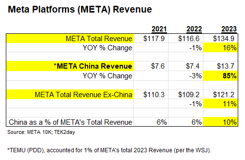 - Temu (China-based parent PDD) accounted for 15% of META’s 2023 China-based Revenue and 1% of META’s Total 2023 Revenue.